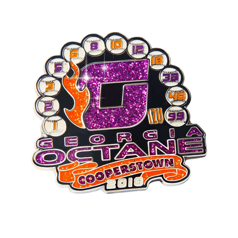 Make your custom softball trading pins unforgettable for an added $0.20. This innovative feature allows the enamel to store and emit a soft glow, ensuring your team trading pins shine at night games or events, creating a unique and exciting personalized sports pins experience.