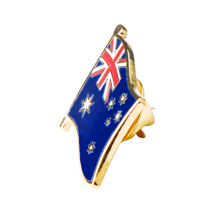 The hard enamel technique ensures that the flag's colors stay vibrant and true to Australia’s national identity. The waving flag shape adds a sense of movement and energy, while the map pin design creatively showcases Australia’s geographic outline with the national flag as a backdrop.