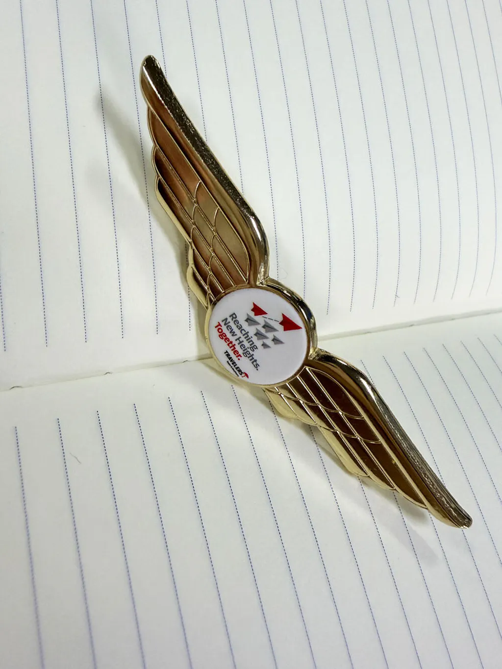 - This pilot wings pin features a classic wing design with a customizable round logo.