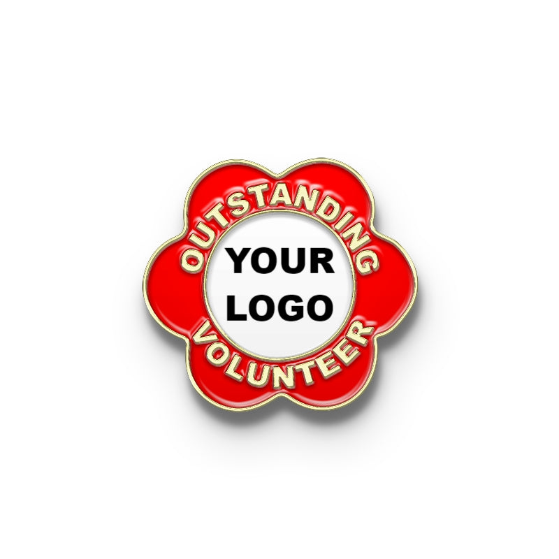 This distinctive volunteer pin is crafted with an eye-catching petal-like shape, making it stand out. The outer perimeter prominently features the text "OUTSTANDING VOLUNTEER," clearly signifying its purpose. The central circular area is dedicated to displaying your organization's logo, ensuring immediate brand association.
