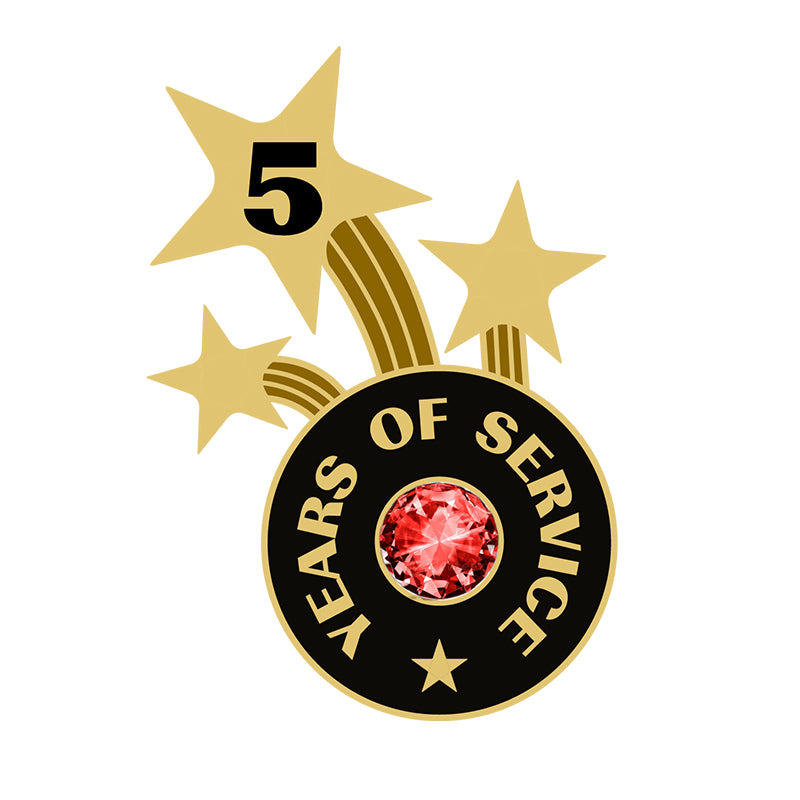 Finished in a polished gold tone, the 1.5-inch layout balances elegance with visibility. The “YEARS OF SERVICE” inscription encircles the gemstone, while finely detailed shooting star accents add motion and prestige. The gemstone is available in multiple colors, allowing you to align with corporate branding or event themes. Each element is precisely crafted to reflect the value of the recipient’s contributions.